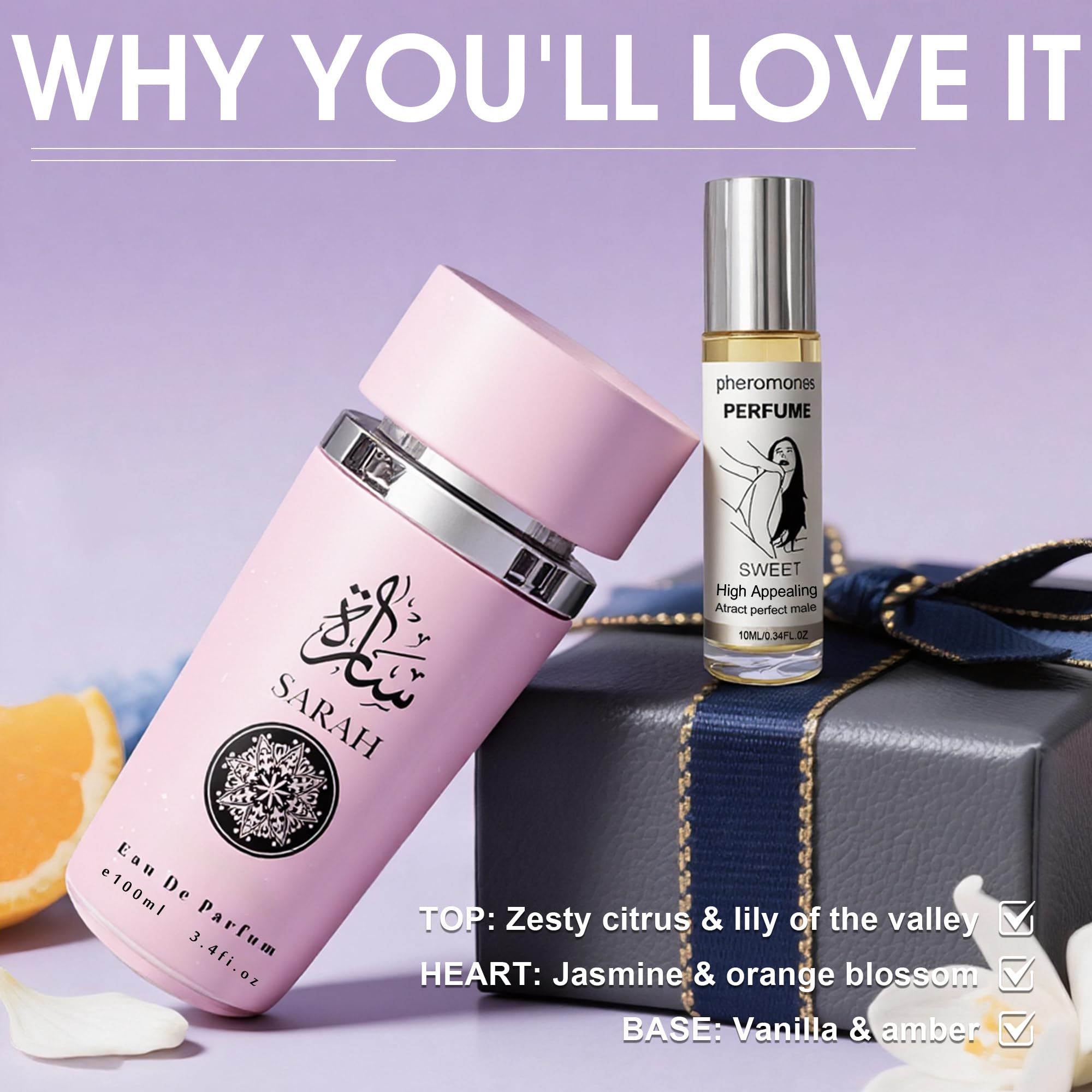 AFLUXE Women's Perfume Set 100ml Eau de Parfum + 10ml Pheromone Roll On Oil | Sweet Floral Gourmand Fragrance with Vanilla | Long Lasting Scent & Attraction Boost | Gift Set for Her (Sarah)
